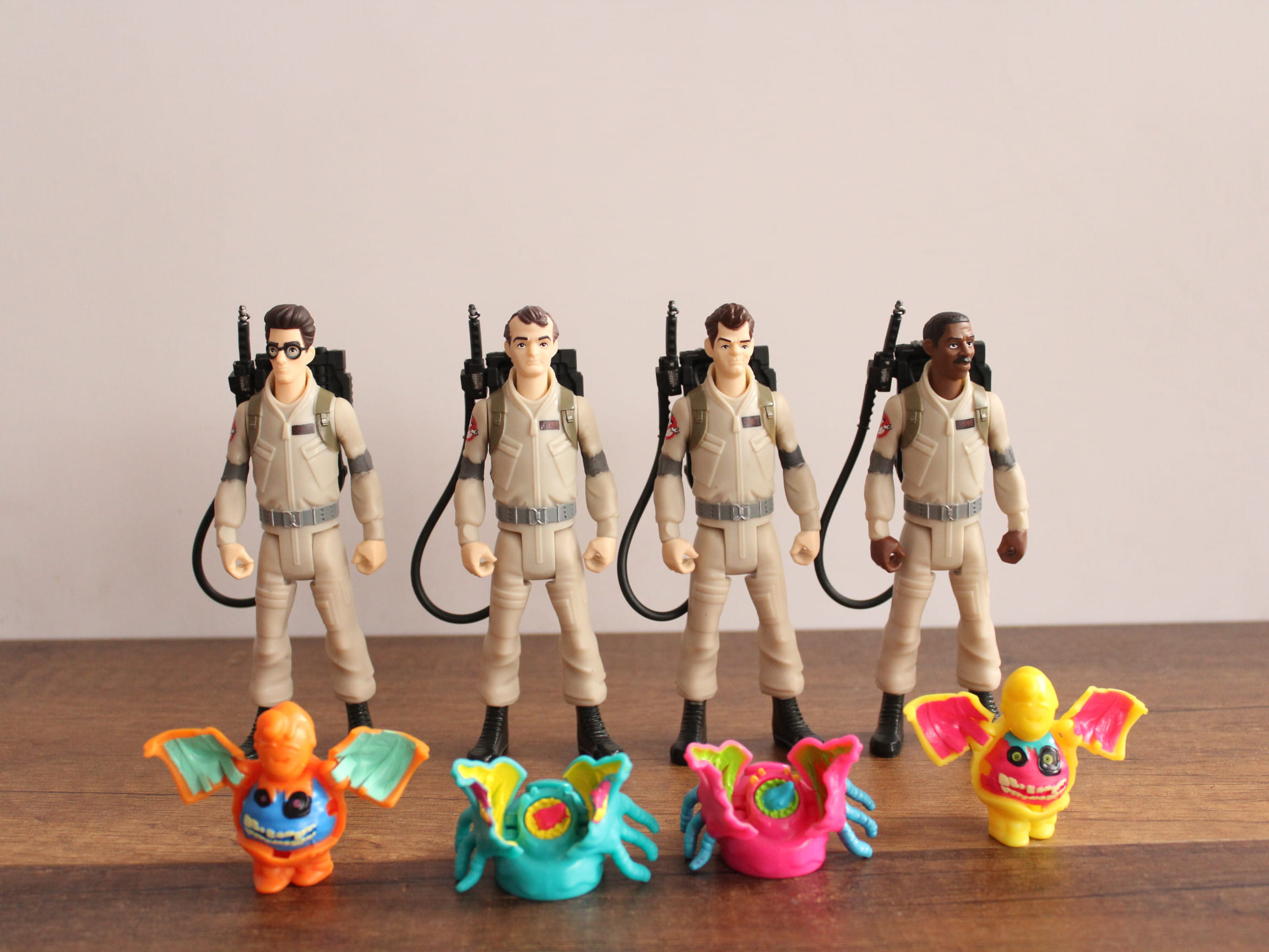 Notas: Apliques de pintura roja, gris y metálica en uniformes y proton packs - incluyen cada uno un fantasma - 5 puntos de articulación - Peter Venkman trae variante de fantasma (no slimer)